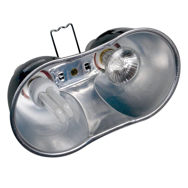 Dual deep dome fixture, one UVB bulb, and one splash-proof halogen heat lamp.