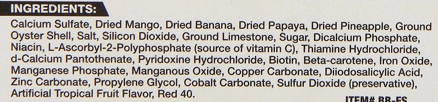 Calcium Sulfate, Dried Mango, Dried Banana, Dried Papaya, Dried Pineapple, Ground Oyster Shell, Salt, Silicon Dioxide, Ground Limestone, Sugar, Dicalcium Phosphate, Niacin, L-Ascorbyl-2-Polyphosphate (source of vitamin C), Thiamine Hydrochloride, d-Calcium Pantothenate, Pyridoxine Hydrochloride, Biotin, Beta-carotene, Iron Oxide, Manganese Phosphate, Manganous Oxide, Copper Carbonate, Diiodosalicylic Acid, Zinc Carbonate, Propylene Glycol, Cobalt Carbonate, Sulfur Dioxide (preservative), Artificial Tropical Fruit Flavor, Red 40.