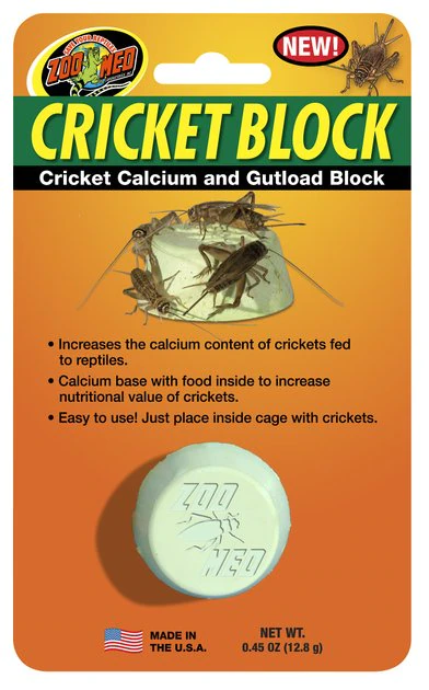 The Zoo Med Cricket Block Reptile Supplement offers an easy way to deliver calcium to insect-eating reptiles and amphibians. It’s a no-mess alternative to calcium dusting that boosts the nutrient content of live crickets—aka gut loading. This calcium-based block has added nutrients and vegetables to optimize cricket health and the reptiles that eat them. It’s easy to use—just place it inside the cage with the crickets and let them feed.