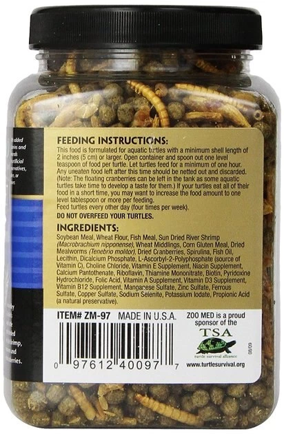 This food is formulated for aquatic turtles with a minimum shell length of 2 inches or larger. Open container and spoon out 1 level teaspoon of food per turtle. Let turtles feed for a minimum of 1 hour. Remove any uneaten food after 1 hour. (Note: The floating cranberries can be left in the tank as some aquatic turtles take time to develop a taste for them.) If your turtles eat all of their food in a short time, you may want to increase the food amount to 1 level tablespoon, per turtle, or more per feeding. Feed turtles every other day (four times per week). Do not overfeed your turtles.