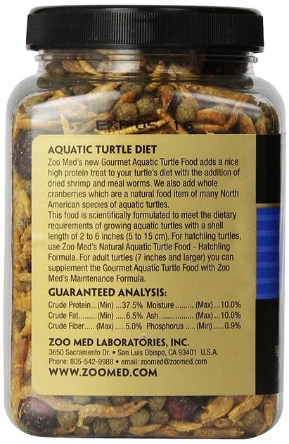 Zoo Med’s Gourmet Aquatic Turtle Food adds a nice high-protein treat to your turtle’s diet with dried shrimp pellets and tasty mealworms. Whole cranberries are also added—a natural food choice for many North American species of aquatic turtles. This food is scientifically formulated to meet the dietary needs of growing turtles with a shell length of 2-6 inches. It’s full of vitamins and minerals and contains no artificial preservatives, colors or flavors.
