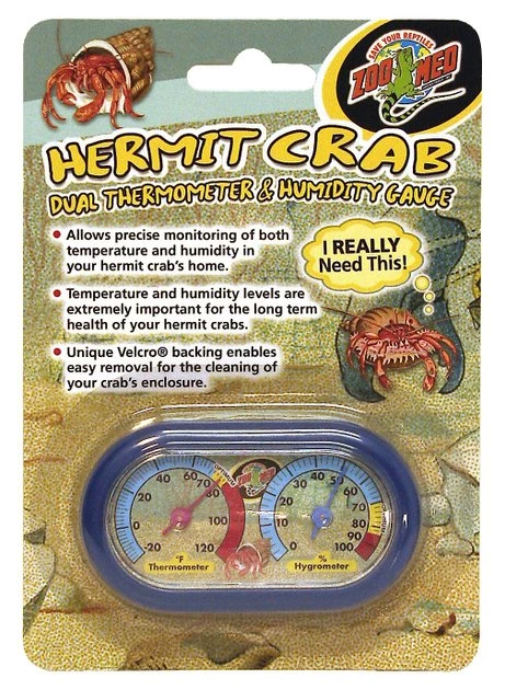Keep your crabby daddy comfy with the Zoo Med Hermit Crab Gauge. This useful tool allows for the precise monitoring of both temperature and humidity. It is designed to be easy to set up and easy to remove with a unique hook and loop backing. This temperature and humidity gauge will help your monitor your amigo’s environment to help ensure proper digestion, facilitate shedding, decrease stress levels and contribute to a long and happy life.