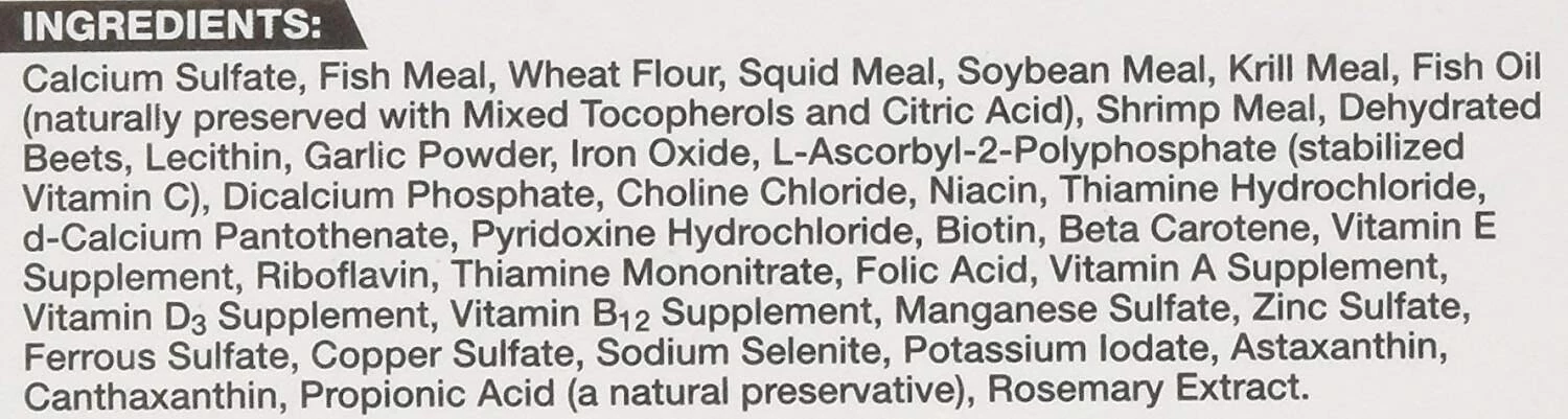 Calcium Sulfate, Fish Meal, Wheat Flour, Squid Meal, Soybean Meal, Krill Meal, Fish Oil (preserved with Mixed Tocopherols and Citric Acid), Shrimp Meal, Dehydrated Beets (added color), Lecithin, Garlic Powder, Iron Oxide, L-Ascorbyl-2-Polyphosphate (stabilized Vitamin C), Dicalcium Phosphate, Choline Chloride, Niacin, Thiamine Hydrochloride, d-Calcium Pantothenate, Pyridoxine Hydrochloride, Biotin, Beta Carotene, Vitamin E Supplement, Riboflavin, Thiamine Mononitrate, Folic Acid, Vitamin A Supplement, Vitamin D3 Supplement, Vitamin B12 Supplement, Manganese Sulfate, Zinc Sulfate, Ferrous Sulfate, Copper Sulfate, Sodium Selenite, Potassium Iodate, Astaxanthin (added color), Canthaxanthin (added color), Propionic Acid (preservative), Rosemary Extract (added flavor).