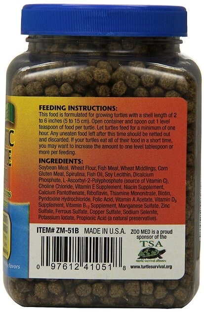 This food is formulated for growing turtles with a shell length of 2 – 6 inches (5 – 15 cm). Open container and spoon out 1 level teaspoon of food per turtle. Let turtles feed for a minimum of 1 hour. Any uneaten food left after this time should be netted out and discarded. If your turtles eat all of their food in a short time, you may want to increase the amount to 1 level tablespoon or more per feeding.