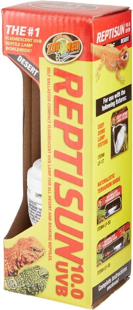 ReptiSun 10.0 is perfect for all desert and basking reptiles! 10% UVB Output, 30% UVA Output, full spectrum bulb. The new ReptiSun Compact Fluorescent lamps use a special UVB transmitting quartz glass for maximum UVB penetration. Cool burning compact fluorescent bulbs screw into standard threaded sockets, eliminating the need for a separate ballast. Lamp can be oriented either vertically or horizontally in your reptile hood or clamp lamp fixture. UVB emissions help prevent or reverse metabolic bone disease and UVA increases feeding, mating, and other natural behaviors.