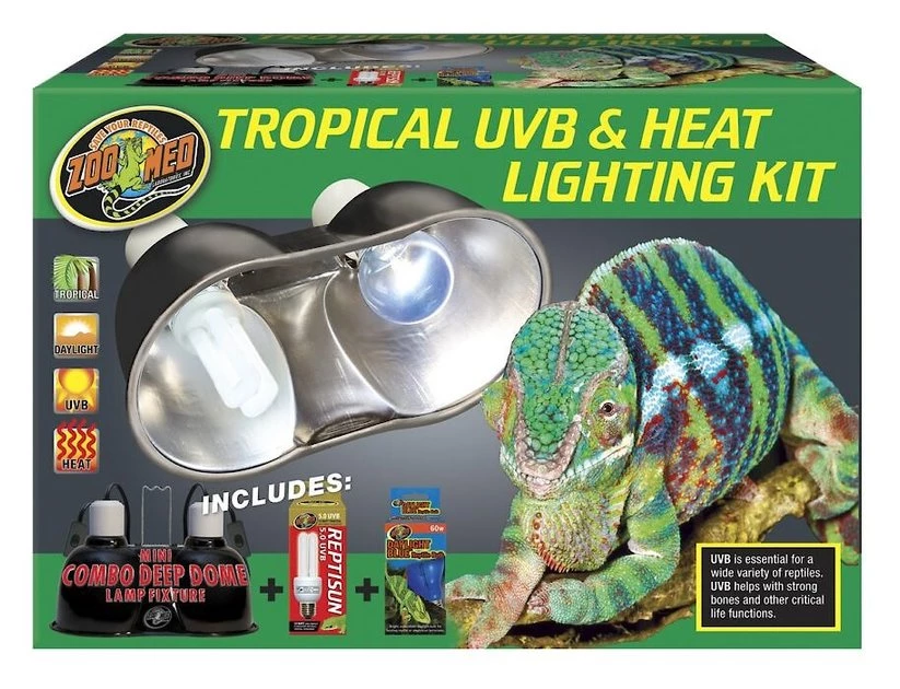 - Complete lighting and heating kit for tropical reptiles is equipped with two deep dome fixtures.