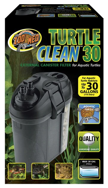 Keep your turtle’s water clean and healthy with the Zoo Med Turtle Clean Canister Turtle Filter. This external canister system is perfect for filtering turtle tanks, vivariums, box turtle pools or turtle tubs. Combining mechanical, chemical, and biological filtering systems―with a sponge, activated charcoal, and bacteria-absorbing ceramic media―and an included spraybar for greater aeration, it efficiently filters water at a rate of 160 gallons per hour. It features a removable hose-connecting device, an adjustable flow control system, and an easy-to-open filter head so it’s easy to use at home. Thanks to the calibrated anti-vibration bushings, it runs smoothly and quietly, and its compact design saves plenty of space.